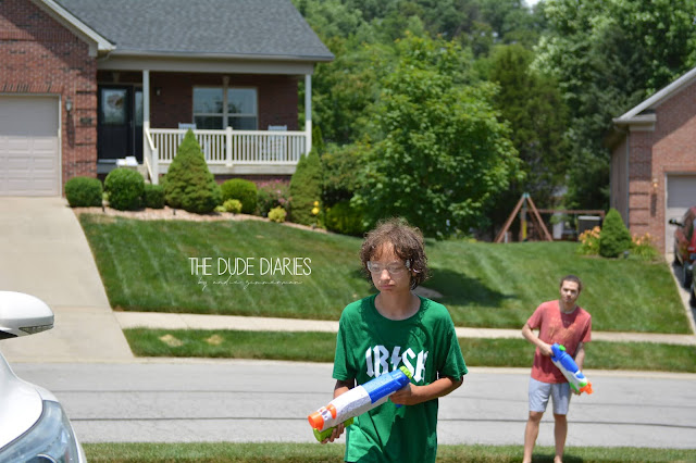 You know, we have probably had these brand new guns stored away for 1-2 years. My neighbor friend found some on sale and picked them up for me to give to the boys. After that, they got thrown in a closet and forgot about. Mom fail. However, in my defense, they were marked down and bought in the colder months so they couldn't use them then anyway. Still a mom fail. Here we are in warm months and I found them looking for something else. Perfect! It was high time the boys got out and did something together. After all, who wouldn't want the opportunity to blast their sibling in the face?! It was so nice watching them play, and I was so happy I found them before it was too late to utilize these water guns. I think Liam got it the worst.